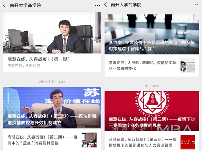 在举国上下众志成城、共克时艰的情况下,南开商科人也一直在行动。专家学者充分发挥专业优势,积极主讲以防疫抗疫为主题的特殊在线课堂。截至目前,“商慧在线,从容战疫”智慧课堂已开展三期共六讲,内容涵盖了《疫情后的创业机会》《提高公共健康风险智慧化治理能力》《疫情中的“居家”消费及其惯性》《区块链赋能疫情防控与长效机制建立》《疫情下对于我国数字商务发展的思考》《疫情危机下的组织进化与人力资源管理创新》等方面,运用商科智慧为科学应对疫情防控,理性面对疫情中、后期的经济现象提供建议参考。创新课堂在南开大学商学院和南开MBA中心微信公众号相继“播课”后,受到师生和校友广泛关注和热烈讨论。