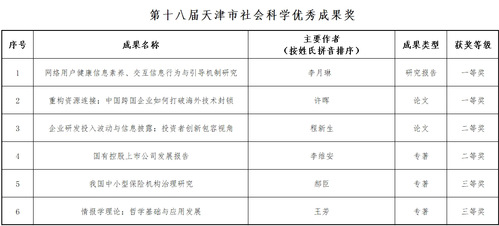 近日,第十八届天津市社会科学优秀成果奖评审结果揭晓。我院共有6项成果获奖,其中一等奖2项,二等奖2项,三等奖2项。