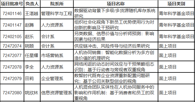8月23日,2024年度国家自然科学基金项目评审结果揭晓,南开大学商学院本年度在创新创业、供应链管理、公司财务、人机协同等重点领域获批8项课题,累计获批资助经费296万元,在项目资助数量和资助金额方面均列我校文科各学院首位。其中青年科学基金项目3项,分别为王湛越、赵腾、赵乐三位老师申报的项目;面上项目5项,分别为姚颐教授、任星耀教授、李全副教授、田莉教授、姚欣林副教授申报的项目。立项情况如下图所示。