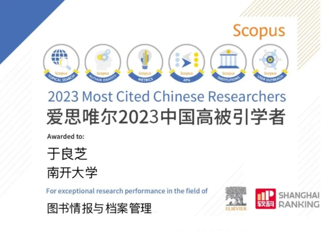 在全球学术界享有盛誉的爱思唯尔(Elsevier)近期发布了2023年度“中国高被引学者”榜单,南开大学商学院信息资源管理系教授于良芝成为南开大学管理学领域唯一上榜学者。这也是她继2020年、2021年后第三次获此殊荣。