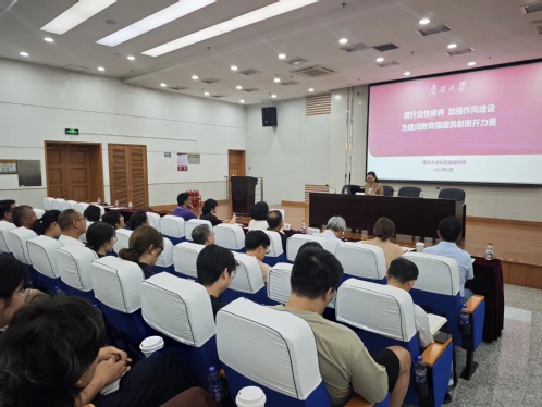 为深入贯彻中央八项规定精神学习教育,扎实推进巡视整改工作,商学院于610日举办专题报告会,特邀校党委副书记、纪委书记、国家监委驻南开大学监察专员赵美蓉作题为“提升党性修养 加强作风建设——为建成教育强国贡献南开力量”的主题报告。商学院班子成员、全体教职工及学生党员代表等参加了学习。