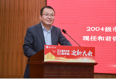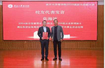 校友代表发言环节中,市场营销专业2004级本科、企业管理2008级硕士,现任和君咨询高级合伙人、区域产业平台事业部总经理的焦海波校友,以“在剧变的世界中寻找自我的秩序”为主题,结合自身求学经历与职业发展历程,向新生们分享了在大学期间积累知识、锻炼能力的重要性,以及面对职场挑战时如何运用南开所学解决问题的经验。通过深入剖析AI +经济、新消费形态等时代趋势,他鼓励学弟学妹们珍惜大学时光,积极参与实践,主动拓展视野,培养全球化思维以适应行业需求,为未来的职业发展打下坚实基础。