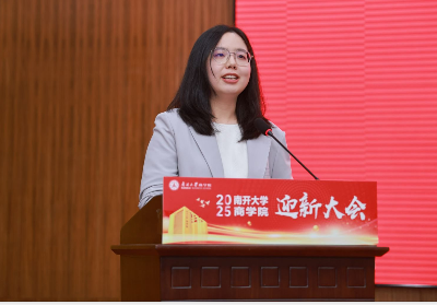 会计学系新入职教师刘筱代表专业教师发言,作为青年教师代表,刘筱老师以亲切的口吻与新生们交流,她以在南开的学习、成长经历为例,为新生提出三大核心建议:以关照身心健康为成长基础,以建立师生同学联结为珍贵收获,以勇于提问并独立思考为探索方向。刘筱老师表示,期待与新生们共同成长,在教学相长中探索商科领域的无限可能。