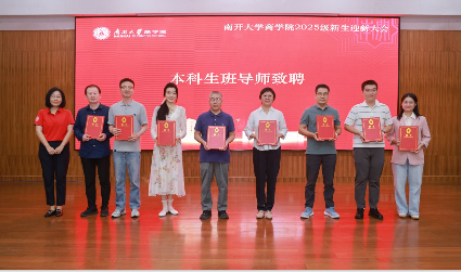 大会第一项议程,奏唱《中华人民共和国国歌》,嘹亮的歌声在报告厅内回荡,庄重的氛围让新生们深刻感受到身为南开人的责任与荣光。国歌奏唱完毕后,大会进入本科生班导师致聘环节,学院领导为受聘的班导师颁发聘书,这一环节不仅是对班导师专业能力与责任心的认可,也让新生们对未来四年的学业指导与成长陪伴充满期待。