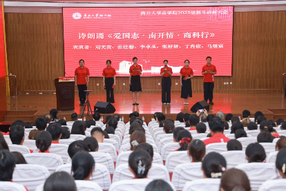 在温馨而励志的分享之后,大会迎来了充满情感张力的诗朗诵环节,学院新老学生代表刘美萱、张桂馨、李卓承、张好妍、丁肖依、马煜宸六位同学共同演绎了诗朗诵节目《爱国志・南开情・商科行》。他们用铿锵有力又饱含深情的声音,将南开的爱国传统、商科人的使命担当融入诗句之中,激昂澎湃而又温情脉脉,生动展现了南开商学院学子的精神风貌,也让新生们更深刻地领悟到“爱国志”的厚 重、“南开情”的真挚与 商科行”的坚定,现场氛围被推向高潮。