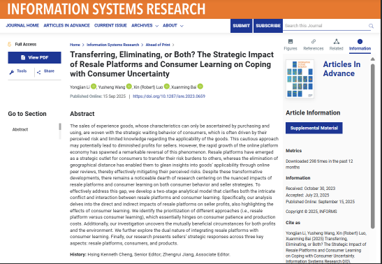 近日,南开大学商学院李勇建教授和其毕业博士生王昱升、白轩铭,与美国新墨西哥大学安德森管理学院Xin (Robert) Luo合作的论文Transferring, Eliminating, or Both? The Strategic Impact of Resale Platforms and Consumer Learning on Coping with Consumer Uncertainty在信息系统与管理科学交叉领域的国际顶级学术期刊Information Systems Research 发表,实现南开大学商学院在该期刊零的突破。其中,博士生王昱升2025年毕业后赴香港理工大学物流与航运学系任研究助理教授,博士生白轩铭2021年毕业后在天津大学管理与经济学部任助理教授。