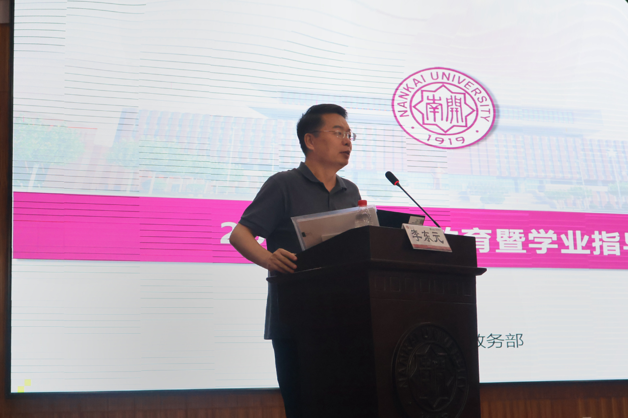 首先,商学院教学科研办公室主任李东元老师上台发言。他为同学们细致解读了《南开大学学生守则》,深入阐释了学校的教育理念与人才培养方案,明确了学生们在学习上的行为准则。他还耐心讲解了“选课”“绩点”“学分”等新生们陌生的概念,化解了大家心中的困惑。此外,李老师也详细介绍了教科办的职责范畴,让同学们在明晰校园服务渠道的同时,更真切地拉近了与大学生活的距离。