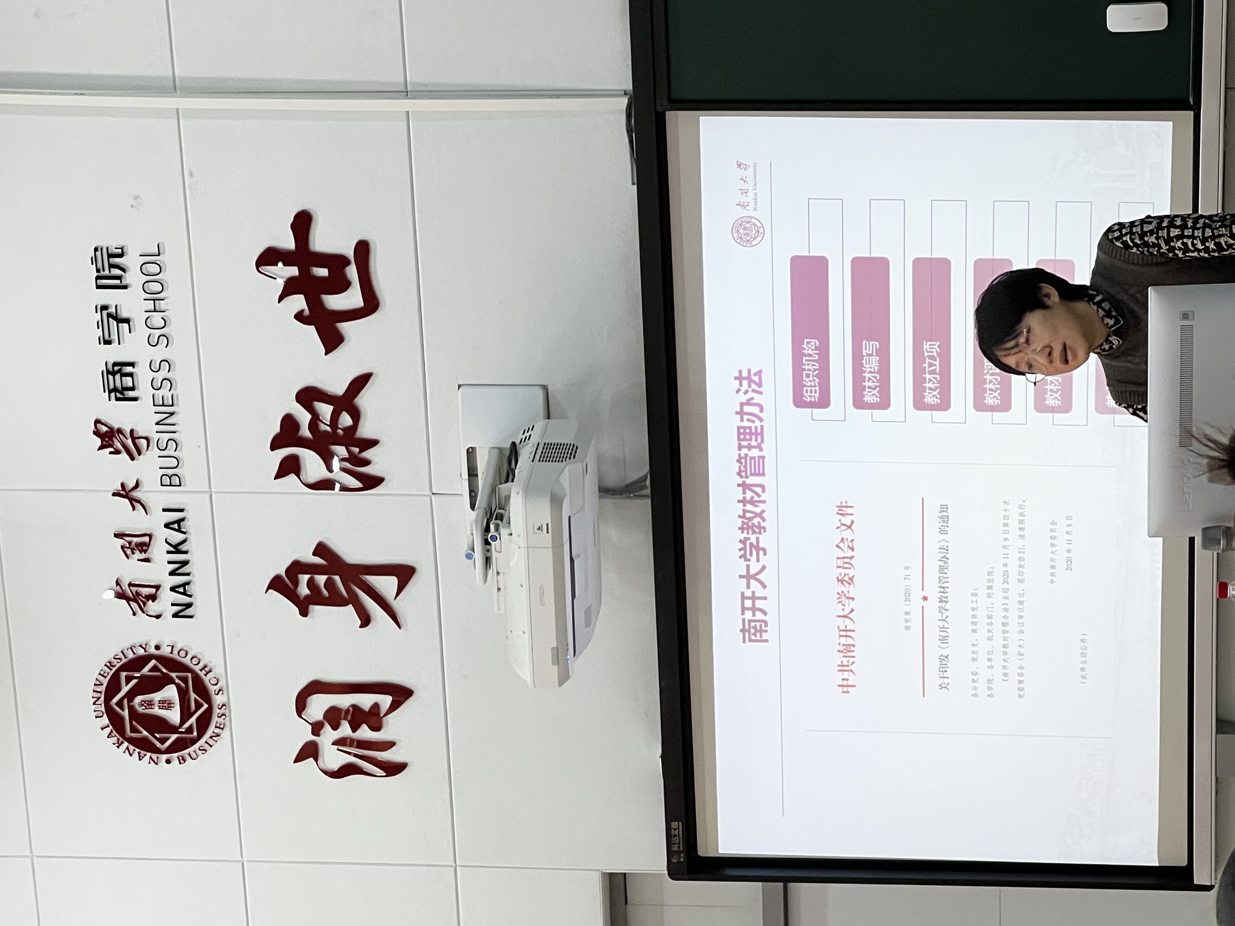 教材建设办公室主任郭泉君围绕教材管理与建设,结合《南开大学教材管理办法》《南开大学“十四五”规划教材建设行动计划实施方案》,强调了教材工作的重要性,“凡编必审”对于人员和内容两方面审核的要求和原则。介绍了新形态教材、中国原创性教材建设方向。