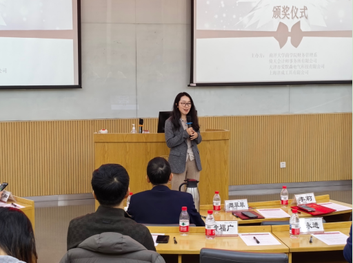 南开大学商学院党委副书记周翠翠、财务管理系主任齐岳、资深教授李莉、校友企业家天津市爱默森电气科技有限公司总经理罗宇尘、天津倚天会计师事务所有限公司董事刘强出席了颁奖仪式。该颁奖仪式由财务管理系副主任张涵支持。