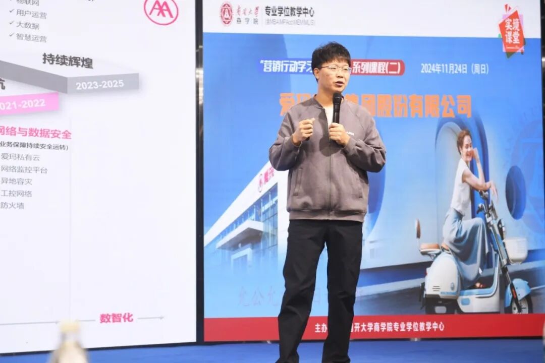 2024年11月24日,南开大学商学院MBA《营销行动学习方案》课程以“沉浸式”实境课堂的形式在爱玛科技集团股份有限公司(以下简称“爱玛”)开展。南开大学商学院许晖教授、南开大学商学院王学秀教授、爱玛首席信息官卢会北和23级选修服务与营销方向的MBA学生们共同参与了本次营销行动学习方案的实践活动。