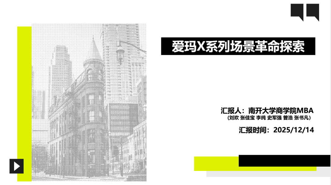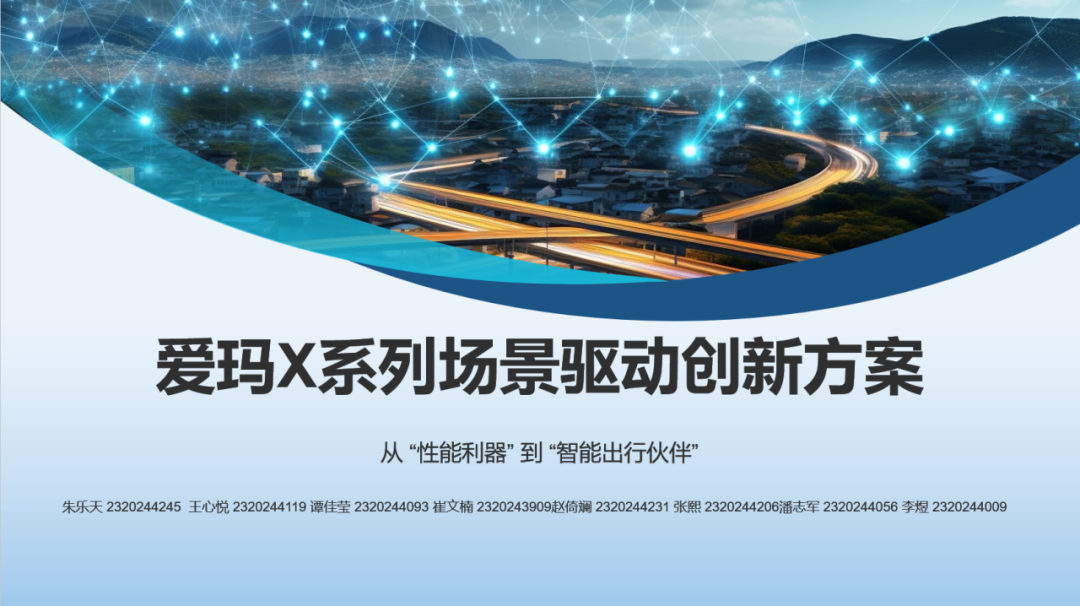 第三位上台展示的成员围绕爱玛X系列“从性能利器到智能出行伙伴”的转型目标展开分析,先深度拆解现有产品定位与核心用户需求,精准定位通勤、短途出游等场景下的用户痛点。基于此提出融合智能交互与极致性能的产品再设计方案,详细论证方案的技术可行性、用户接受度及商业变现潜力。