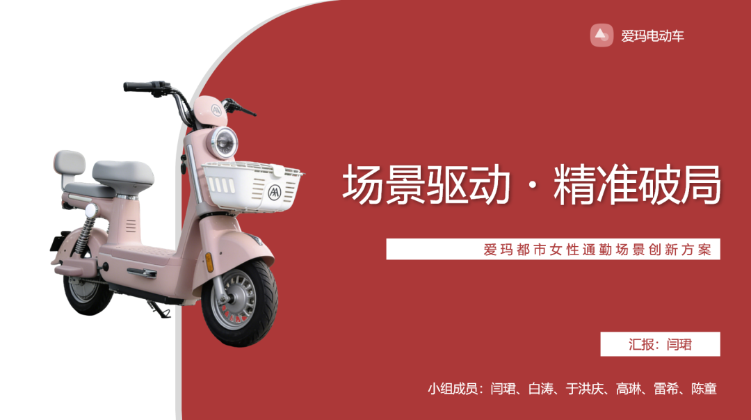第二位上台展示的成员以爱玛X系列高端电动两轮车为研究对象,明确其“机甲设计风格+前沿智能配置”的核心差异化定位,精准锁定25-35岁追求科技感与性能的男性用户群体。PPT系统呈现了产品核心技术参数、智能功能模块详情,结合典型用户使用案例佐证产品优势,并制定了针对性的市场推广与用户运营策略。