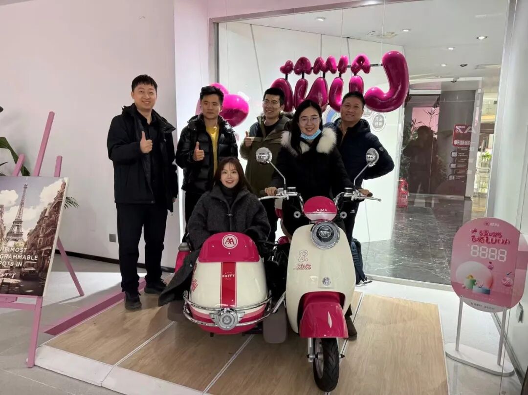 整体参观结束后,卢总重点围绕代表性车型展开了更加细致的讲解,从车型的核心参数、前沿技术特色,到原创设计理念、精准产品定位,再到市场推广策略,为师生们展开了一幅完整的智能出行产品打造图景。此外,卢总还结合具体案例,生动讲述了每款产品背后的研发故事,重点分享了爱玛如何凭借核心技术优势与数字化创新手段,实现产品品质升级与外观迭代,持续为用户打造高品质、个性化的时尚出行体验。展厅内,造型圆润可爱、续航扎实的“墩墩车”让人眼前一亮,成为不少师生的关注焦点;而外观优雅灵动、色彩柔和细腻、搭载多项智能交互功能的“LUNA车”,则精准契合女性出行需求,尽显设计巧思。师生们兴致盎然地围绕两款代表车型驻足观摩,不时交流探讨,更有不少同学亲身“试驾”体验,与心仪车型合影留念,现场氛围热烈而活跃。