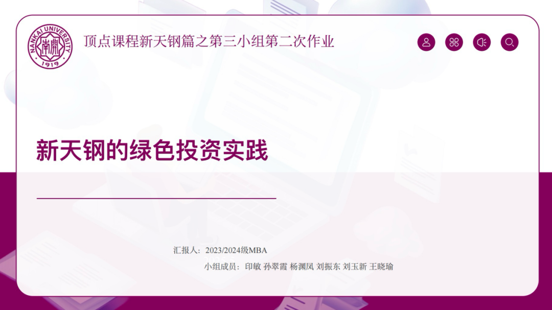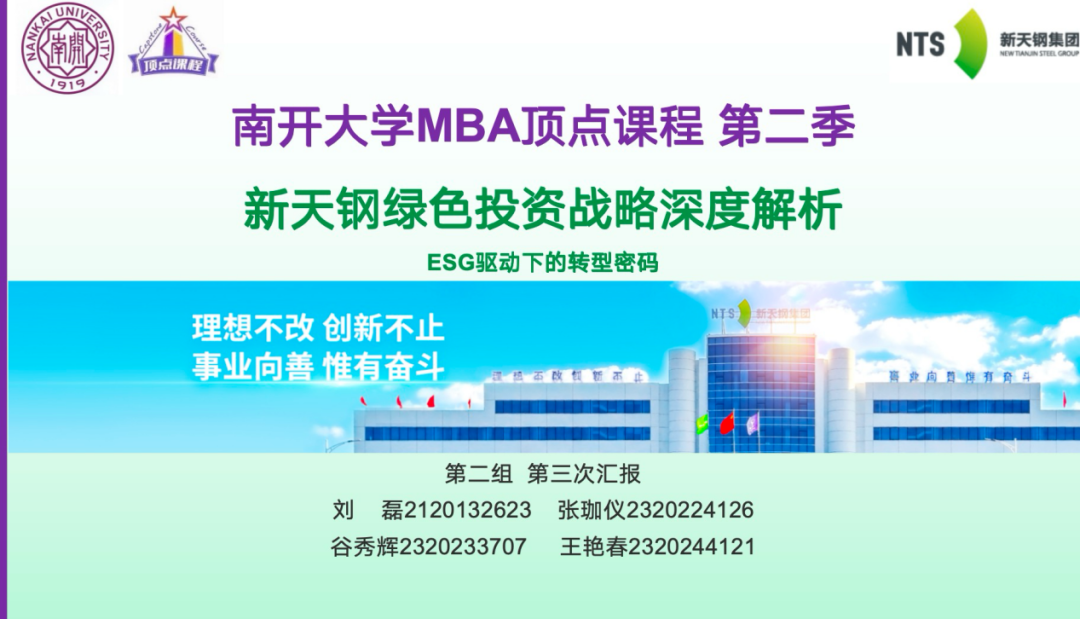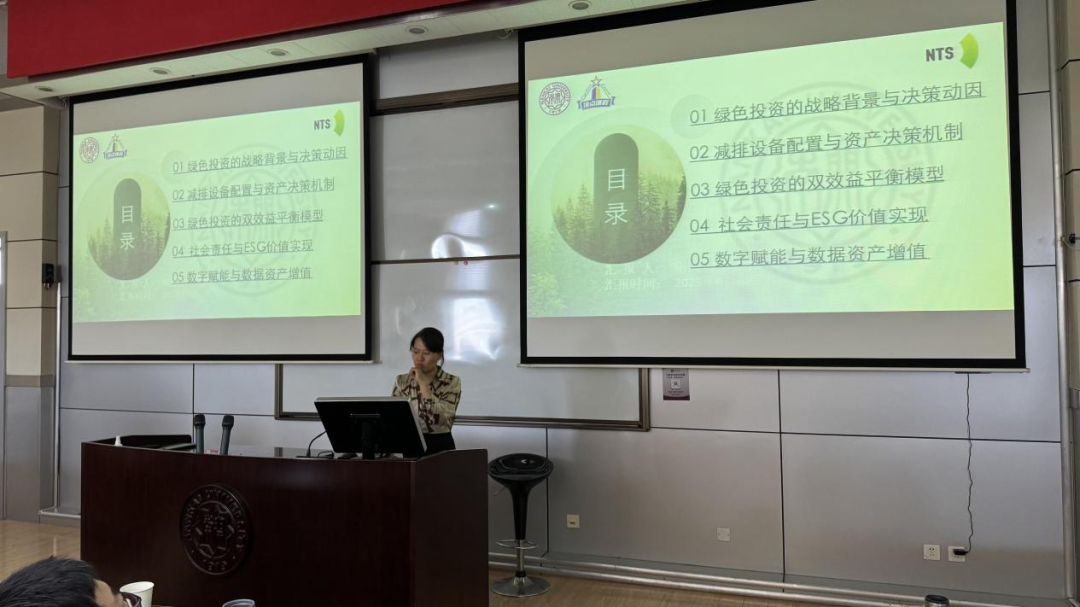第一组同学(成员:谢博、周海涛、仲继宇、闻天歌、李洪涛)以财务视角切入,详细阐述了新天钢集团绿色投资的动因、落地过程及经济效益。新天钢集团的绿色投资是基于行业趋势和企业自身发展的战略选择。在环保政策日益严格的背景下,新天钢通过绿色投资实现了经济效益与环保效益的双赢。数据显示,新天钢集团在绿色投资方面的初始投入虽增加了折旧费和财务费用,但从长期来看,通过优化生产流程、提高效率、降低运营成本,成功实现了边际成本下降和经营杠杆上升。此外,绿色投资还降低了企业面临的外部风险,如原材料价格波动和碳排放成本,增强了企业的长期竞争力。同时还强调了新天钢集团在社会责任和 ESG(环境、社会和公司治理)方面的积极表现。企业不仅通过绿色投资减少了污染物排放,还积极参与社区建设,提升了员工福利,塑造了良好的企业形象。