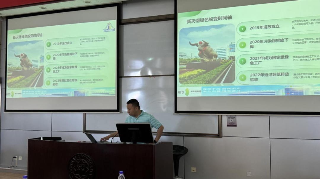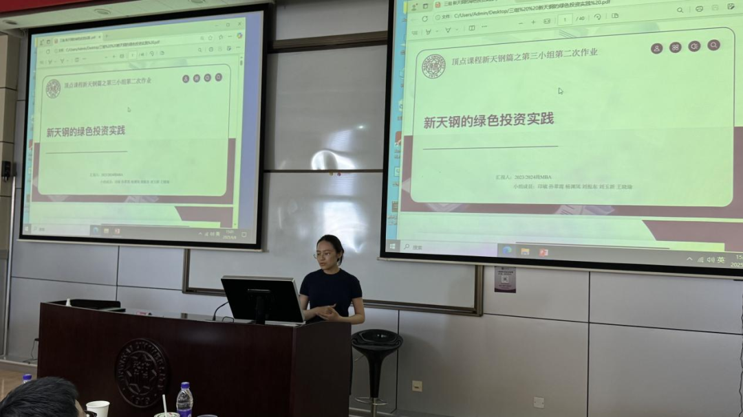 在下午的课堂上,同学们分小组对新天钢集团的绿色投资实践进行了汇报,李莉教授、杨斌教授、周宏斌教授和德龙钢铁集团投资总监裴海滨进行点评和答疑。聚焦于新天钢集团的绿色投资实践、数字化转型以及数据资产化探索,同学们从不同维度深入剖析了新天钢集团的发展之路。