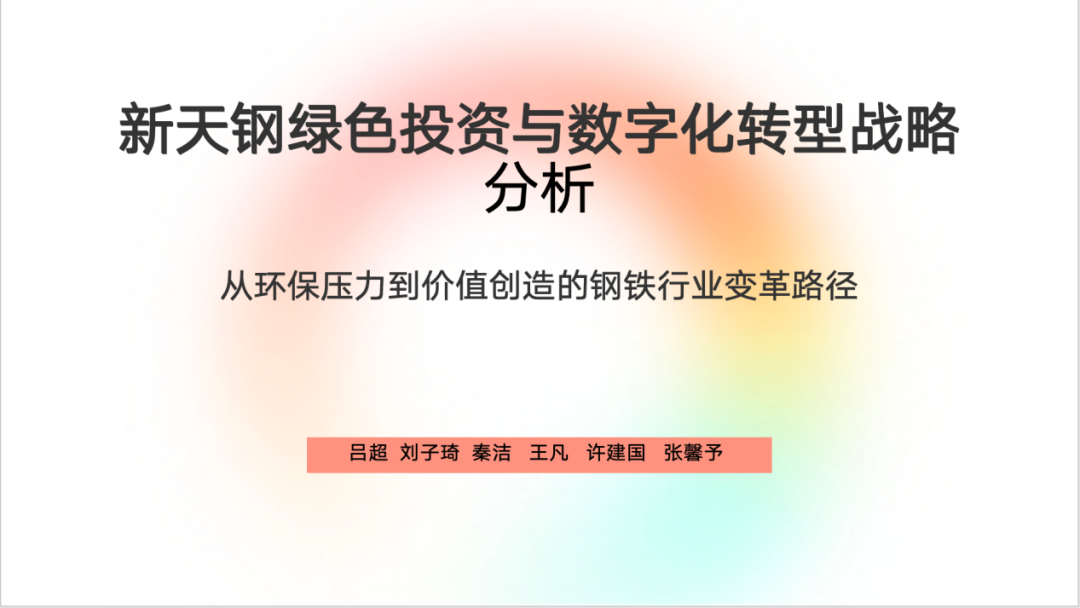 第四组同学(小组成员:吕超、刘子琦、秦洁、王凡、许建国、张馨予)从中国中冶进行对比分析,从综合角度对新天钢集团的绿色投资和数字化转型进行了分析。绿色投资与数字化转型相辅相成,共同推动了新天钢集团的高质量发展。绿色投资为数字化转型提供了基础,而数字化转型则为绿色投资提供了技术支持和数据保障。小组成员以新天钢集团的超低排放改造和数字化看板为例,展示了绿色投资与数字化转型如何在实践中相互促进,新天钢集团通过绿色投资和数字化转型,不仅提升了企业的经济效益,还实现了社会效益和环境效益的统一。